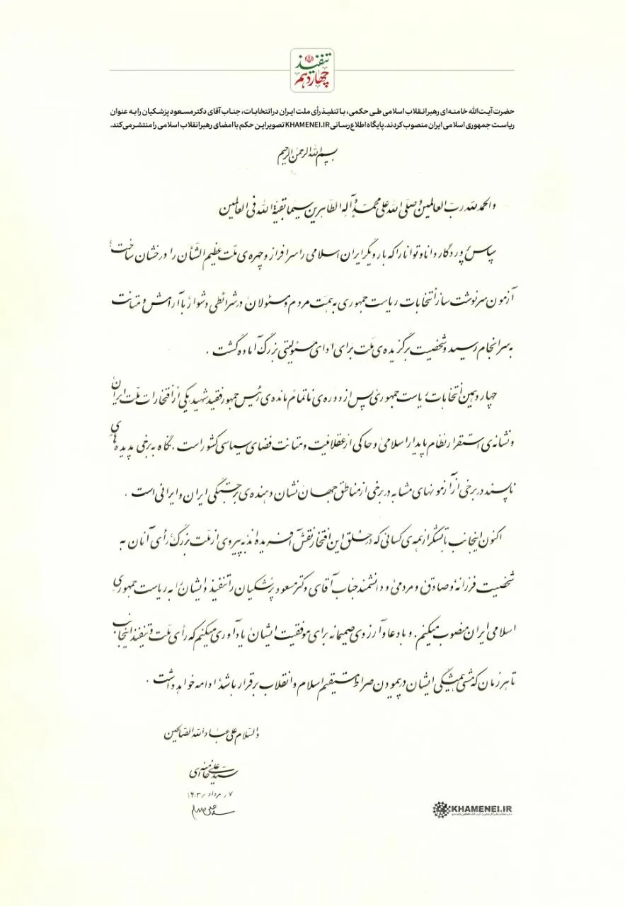 اکنون اینجانب با تشکر از همهی کسانی که در خلق این افتخار نقش آفریدهاند، به پیروی از ملت بزرگ، رأی آنان به شخصیت فرزانه، و صادق، و مردمی، و دانشمند جناب آقای دکتر مسعود پزشکیان را تنفیذ و ایشان را به ریاست جمهوری اسلامی ایران منصوب میکنم. و با دعا و آرزوی صمیمانه برای موفقیت ایشان، یادآوری میکنم که رأی ملت و تنفیذ اینجانب تا هر زمان که مشی همیشگی ایشان در پیمودن صراط مستقیم اسلام و انقلاب برقرار باشد، ادامه خواهد داشت.