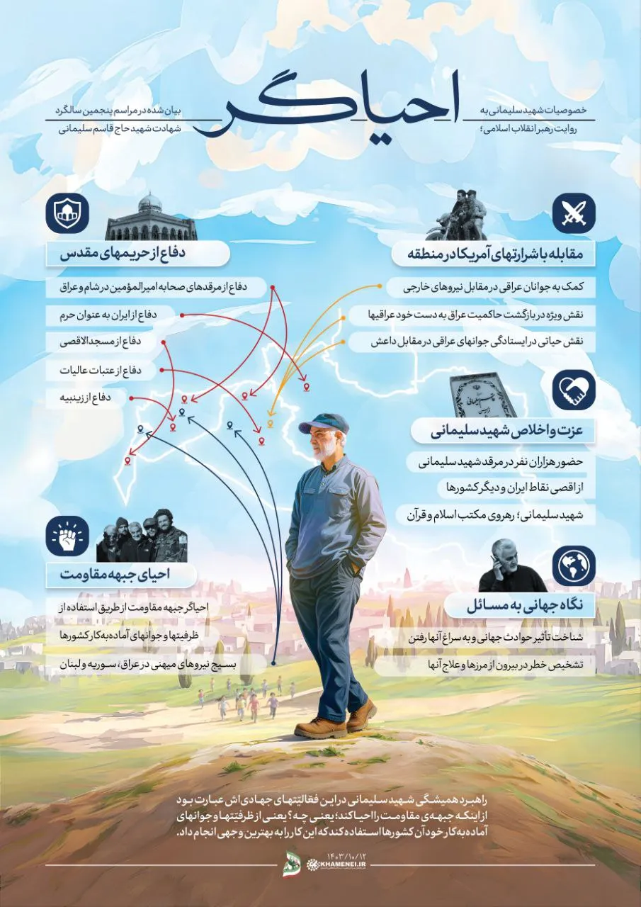 واقعاً داعش آفتی بود و هست و شهید سلیمانی در این میدان خوب وارد شد... کار اساسی شهید سلیمانی در واقع این بود، یعنی حفظ مقاومت و رشد دادن مقاومت، مجهّز کردن مقاومت، احیای مادّی و معنوی مقاومت. به اینها روحیه میداد، معنویّات میداد، خط میداد، راه نشان میداد، گاهی دستشان را میگرفت، میبرد به آن سمتی که باید بروند از لحاظ معنوی و از لحاظ روحی. از لحاظ مادّی هم دست اینها را قوی کرد. ۱۴۰۱/۱۰/۱۱